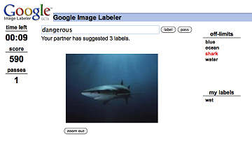 Google’s Image Labeler game is another relatively famous example. This launched a few years ago. Google has an image search, of course — but it’s notoriously hard for them to identify what a given image may be of. To help with this, they released this game. Two users play cooperatively. An image is shown and both are asked to tag it — but they can’t see one another’s tags. So. When the players match tags, they get points. And Google, then, has a pretty good idea that the tag describes what’s in the image because two people have thought of it independently. It’s cross-checked, in a way. So Google has taken this, another fairly tedious sort of data-processing task, and by applying some elements of game design has made it fun for people to do — with a great side effect of actually helping Google improve the quality of their image search. Very cool.