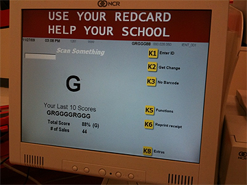 And speaking of American Idol, have you seen the ads with last year’s winner Kris Allen hocking this? The new Toyota Prius has something called “Efficiency Leaves” — little leaf graphics on the dashboard you earn by driving efficiently. Save gas. Get points. This stuff is showing up everywhere once you start keeping an eye open for it. Here’s another — a photograph of a checkout terminal at a Target store. Employees are given letter grades and an overall score depending on how efficiently they check people out. This person’s apparently got a score of 88%.